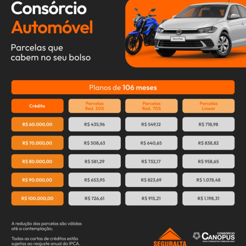 Realizar sonhos não precisa ser um peso no bolso. Com o consórcio, você investe no seu futuro com planejamento e sem juros! É a forma mais inteligente e acessível de conquistar seus objetivos!